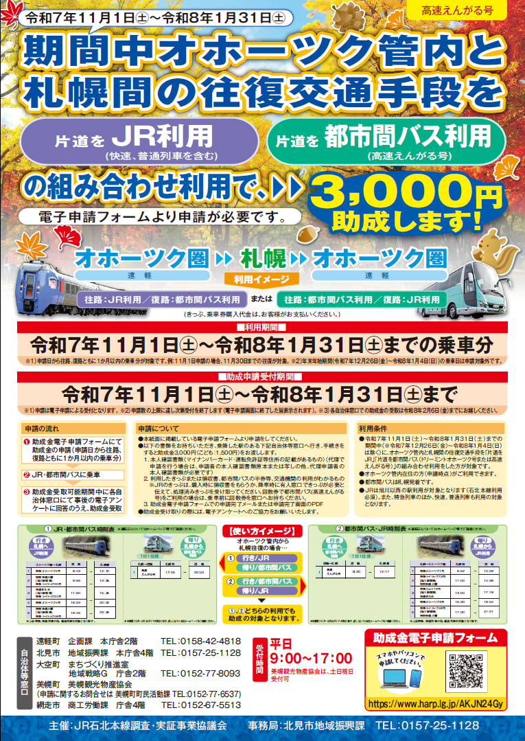 北見市役所 地域振興課が事務局となっているJR石北本線調査・実証事業協議会では、石北本線の維持・活性化のため、オホーツク管内と札幌間の往復交通手段を「片道JR」、「片道都市間バス」の組み合わせ利用で『3,000円助成』します。