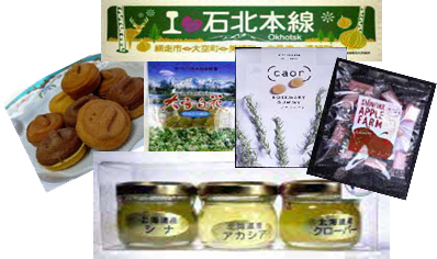 熊のまくら、フィナンシェ、白花豆プリン、帆立薫油漬け、菅野養蜂場のオホーツク蜂蜜セット、ローズマリーグミ、石北線ステッカーなど