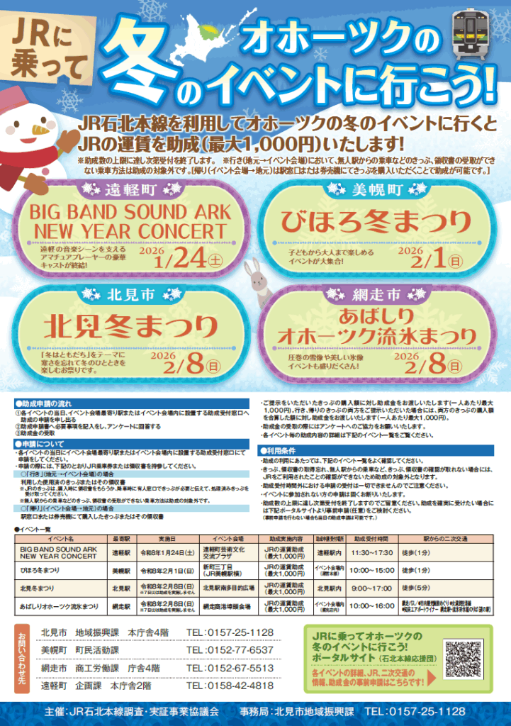 JR石北本線を利用してオホーツクの冬のイベントに行くと、JRの運賃を助成(最大1,000円)いたします!